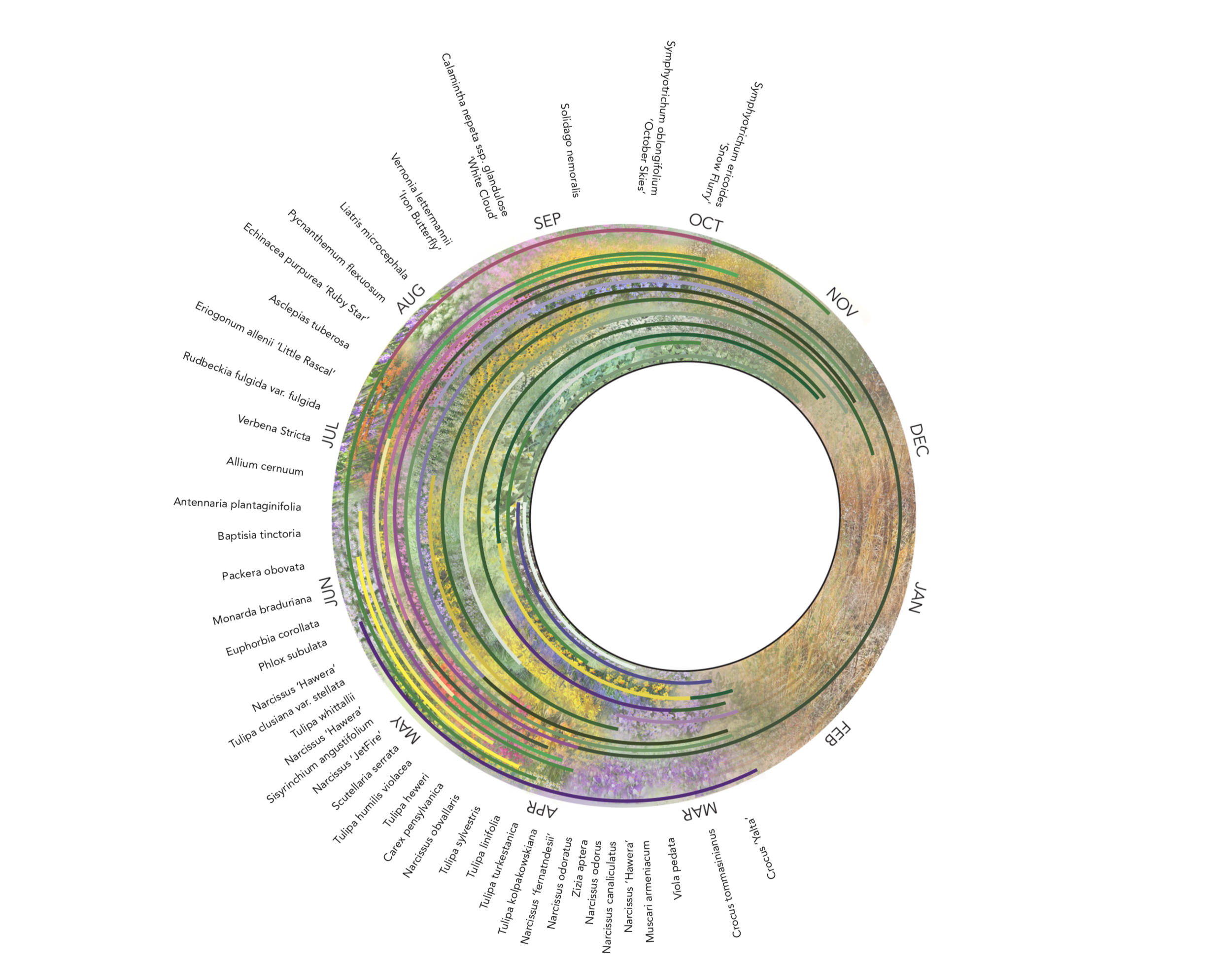To sustain broad populations of pollinators, there should always be an abundance of “food on the table”. Our team gathered significant research in order to identify and understand regional pollinator communities and their needs. Working closely with Phyto Studio, we created a strong organizing framework for the garden with special focus given to native generalist plants with high value for pollinators. Incorporating high family, genus, and species diversity, we were able to fill a wide range of spatial and temporal niches and offer extended blooming period with no gaps.