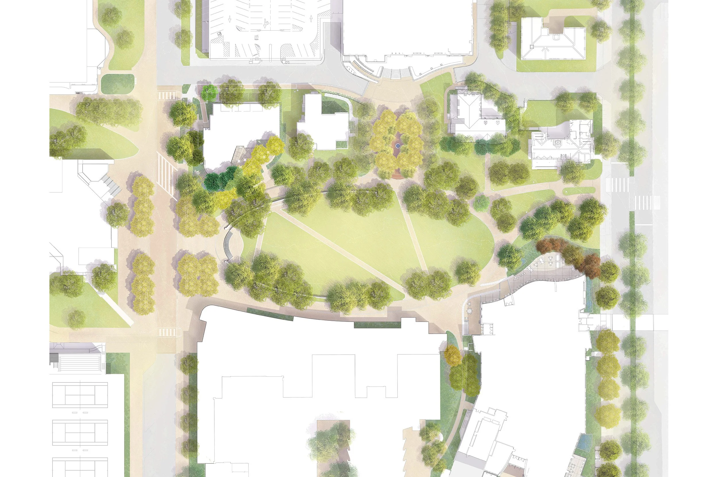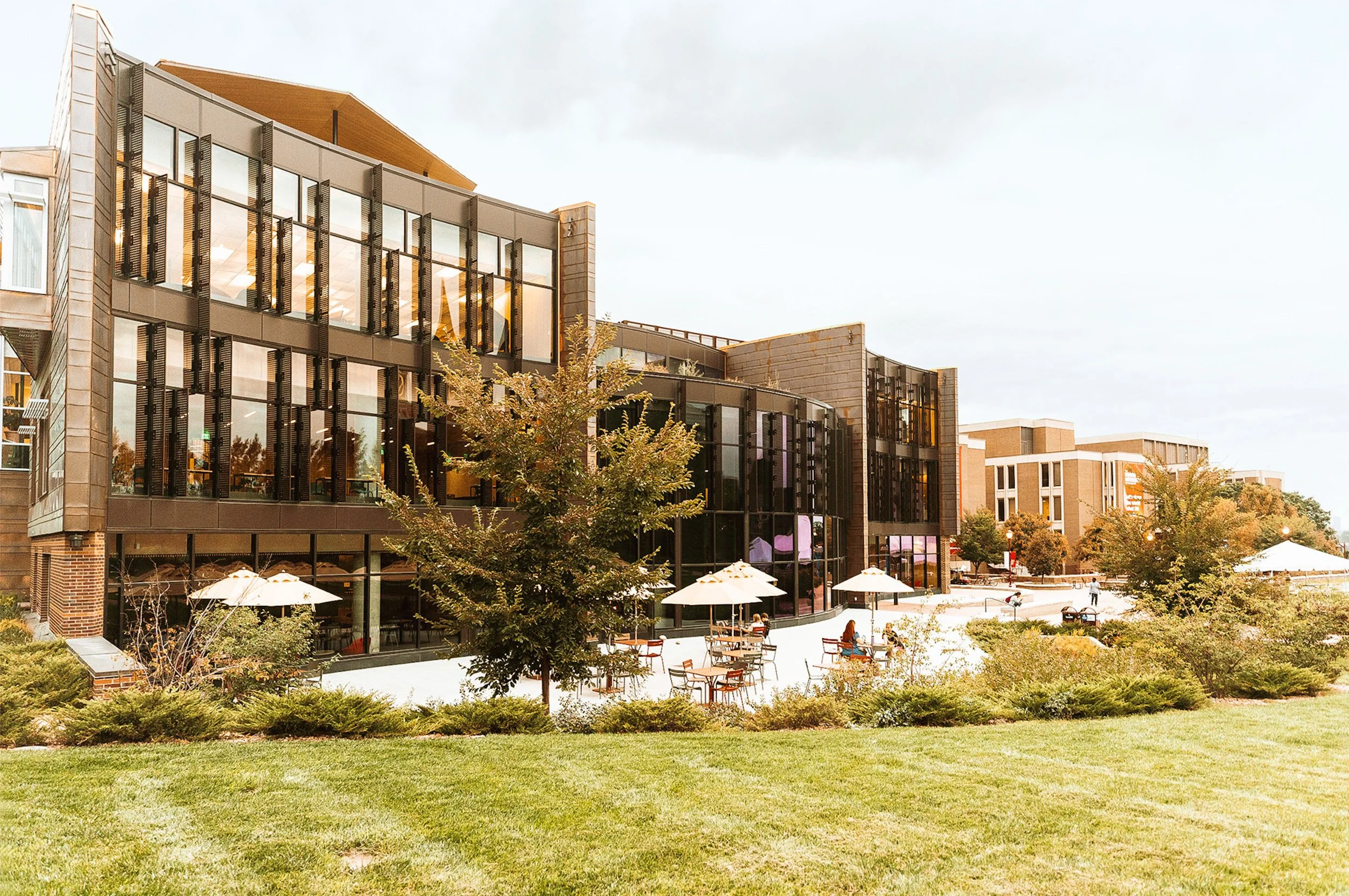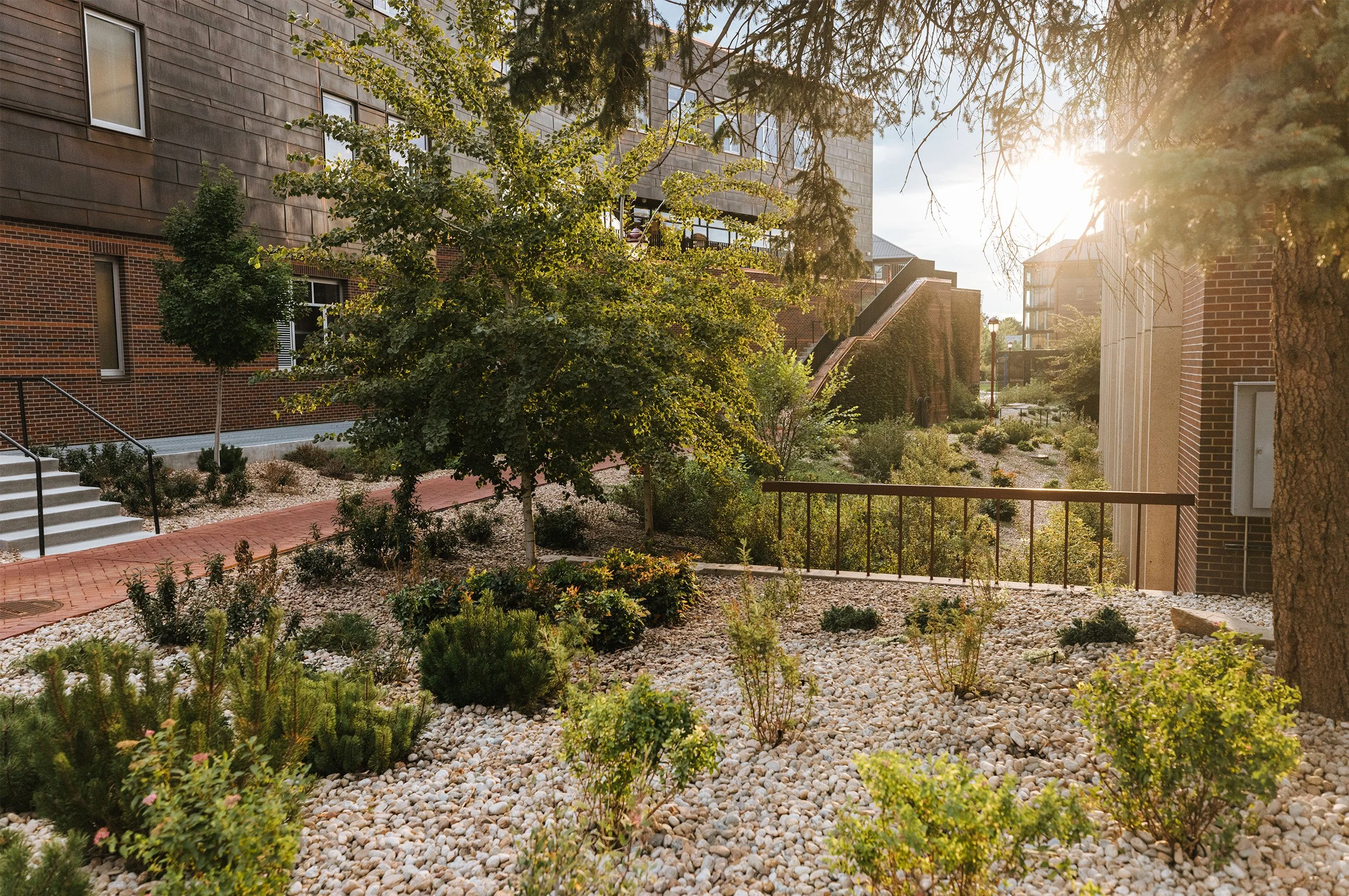 The DU Advantage projects completed in 2021 include a new community commons building, a new residence hall for first year students, and a new career center, all centrally located adjacent to the University’s Campus Green. As the landscape architect for all three projects, Didier Design Studio assembled a unified vision for the landscape with consideration toward biodiversity, habitat and water conservation while crafting key social nodes for interaction and engagement.